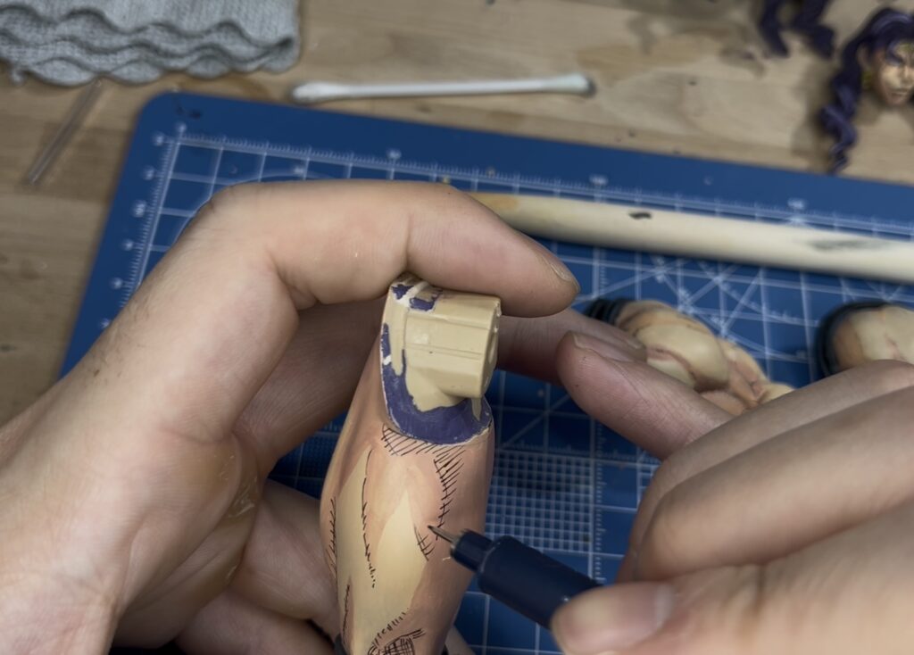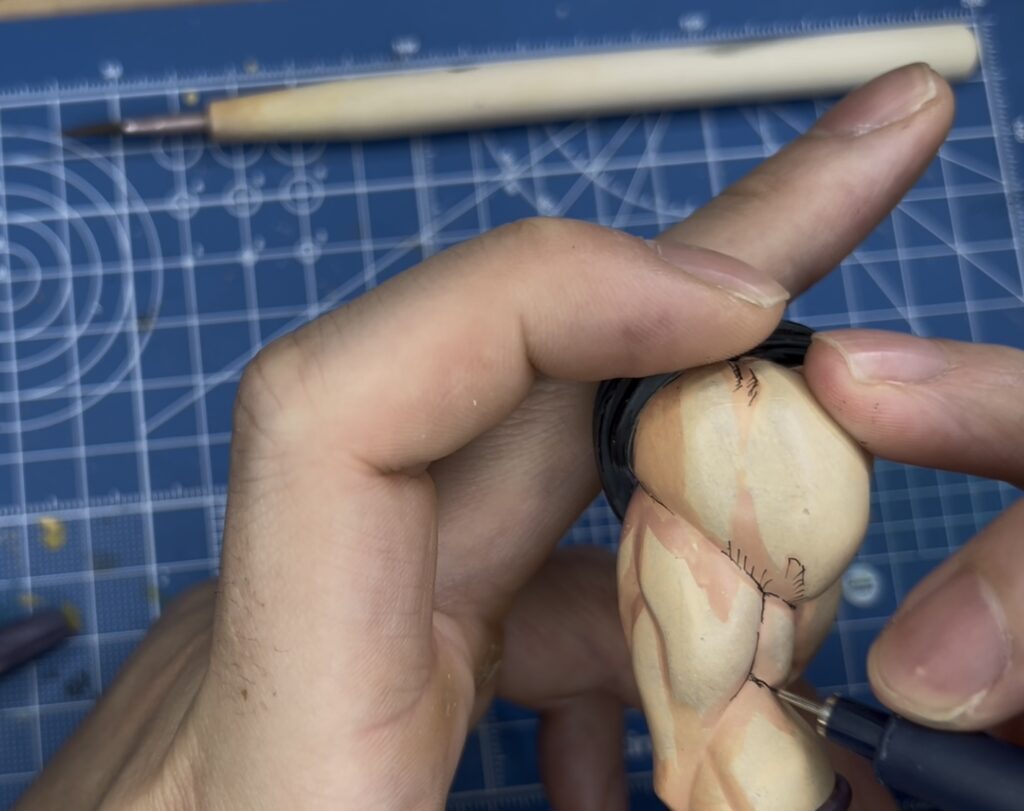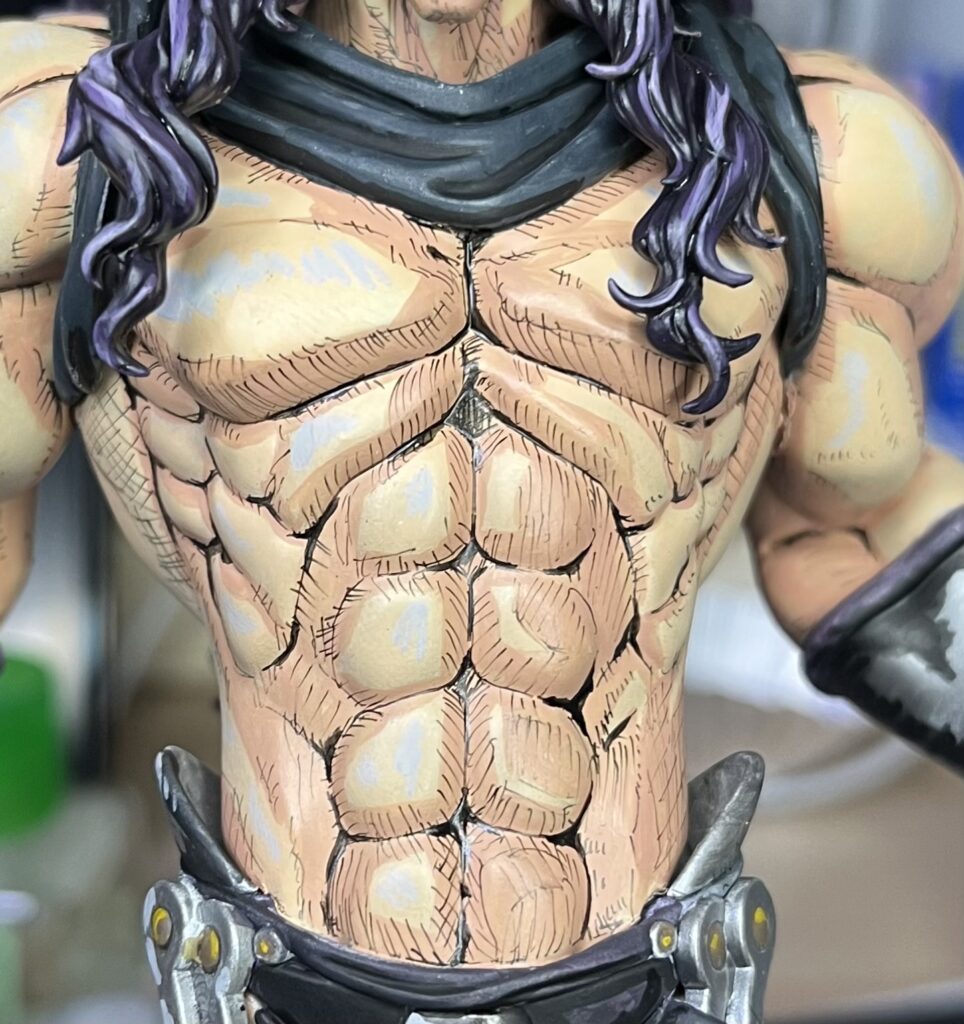 筋肉の溝に対して墨入れのように線を描いたり斜線を引いて陰影を追加していきます。
